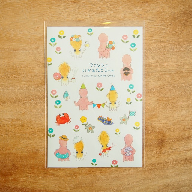 イラストレーターおりでちせさんのシールです。 お花といか&たこ、ドーナツを持ったいか&たこ、海辺で遊ぶいか&たこ。 ファンシーでかわいいいか&たこと仲間たちのデザイン。 ノートやお手紙のデコレーションに♪ ハガキサイズの台紙に10点分のカットが入っています。 表面はマットな紙製シール。ダイカットシール部分は白地です。 内容:1シート(シール10点) サイズ:W100×H148mm 推奨用途:屋内使用(非耐水性) 粘着力:しっかり ◆ご覧いただく環境により、実物の色とは若干異なる場合があります。 ご了承のうえお買い求めくださいませ。