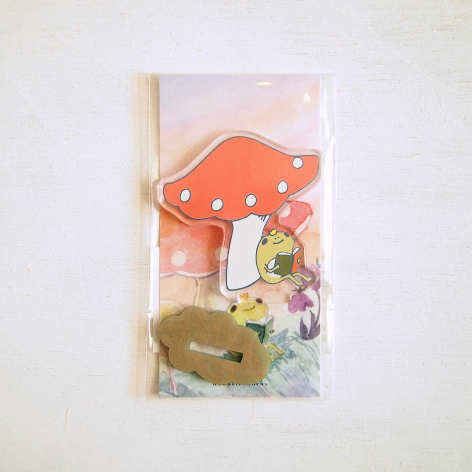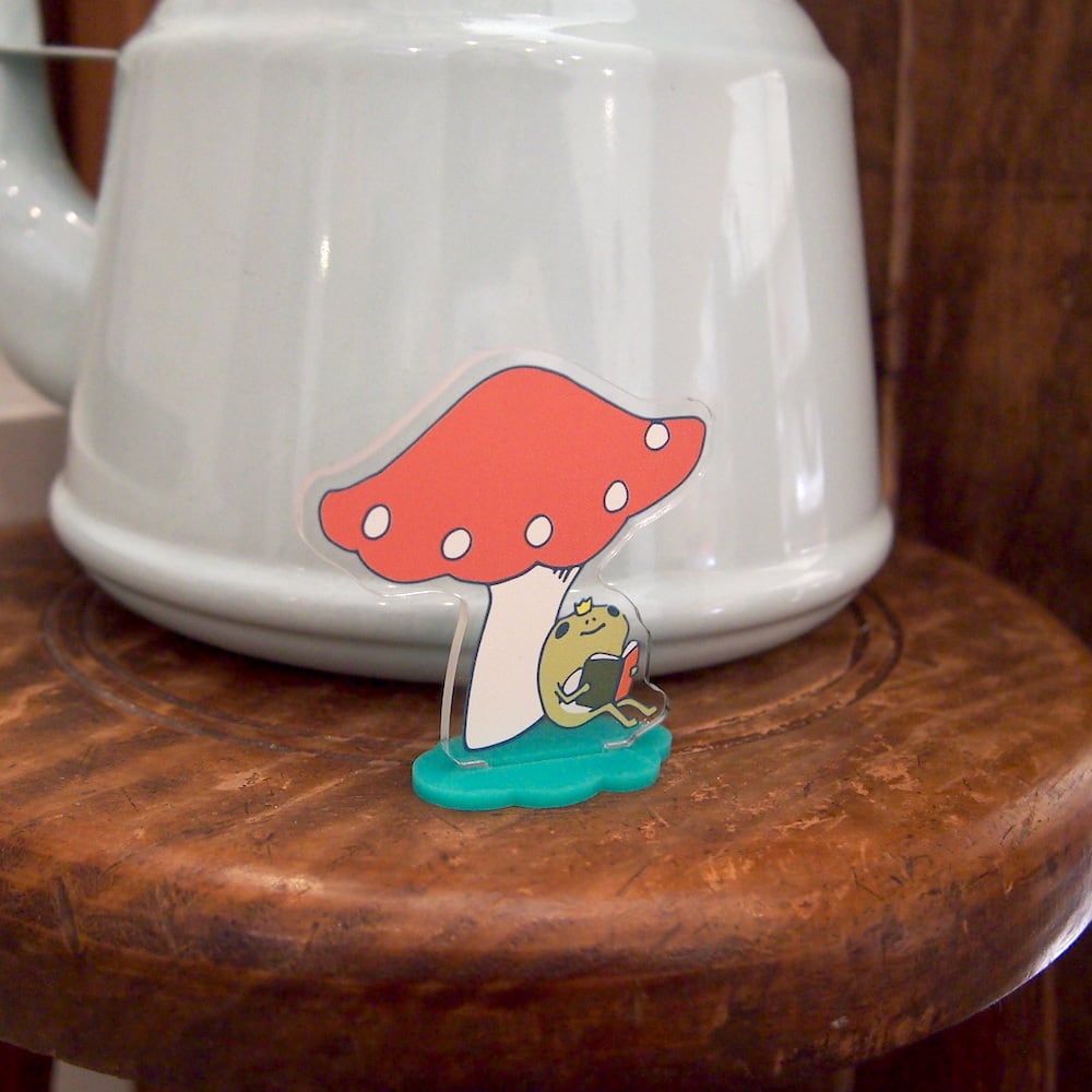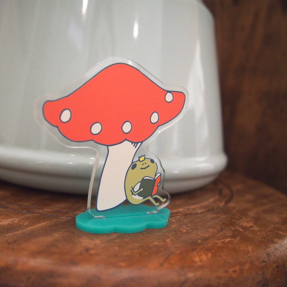 キノコの下で本を読むカエル王子のデザインです。