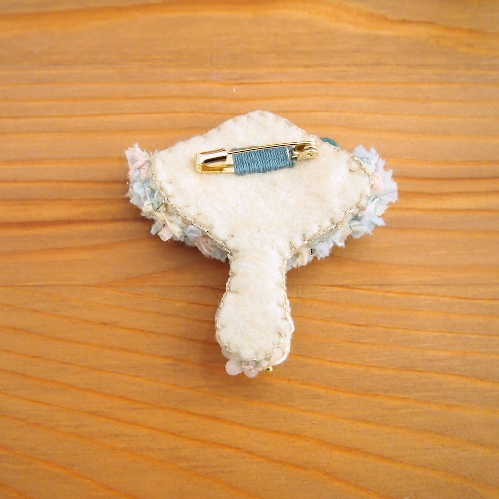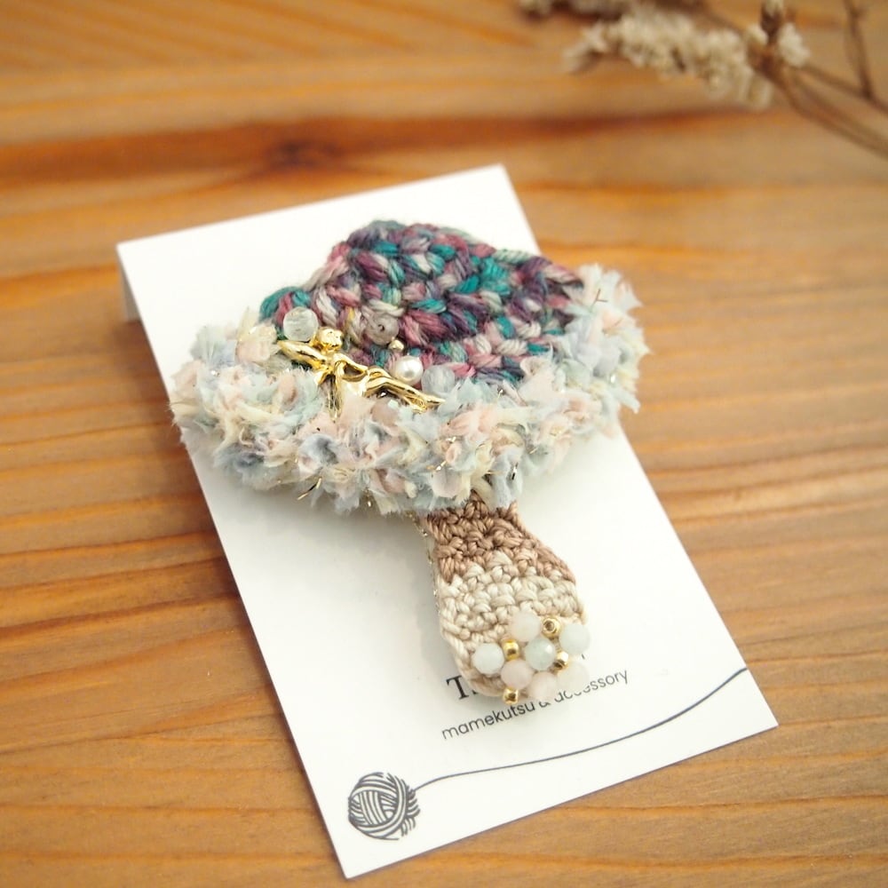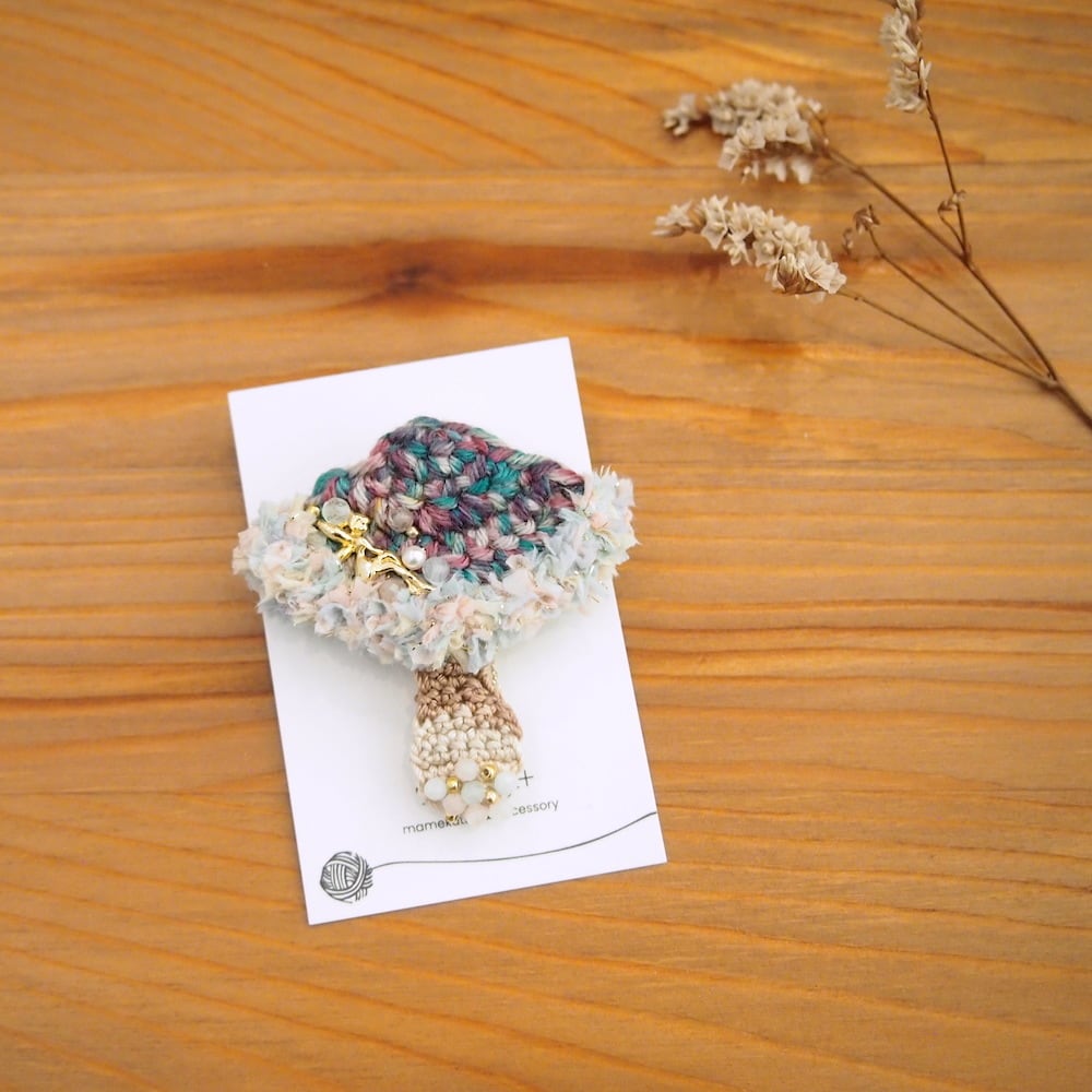 カラフルな糸で編んだキノコのブローチ。