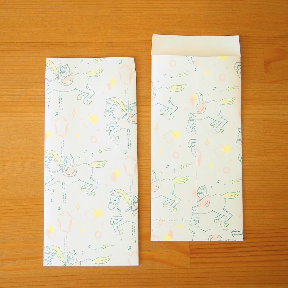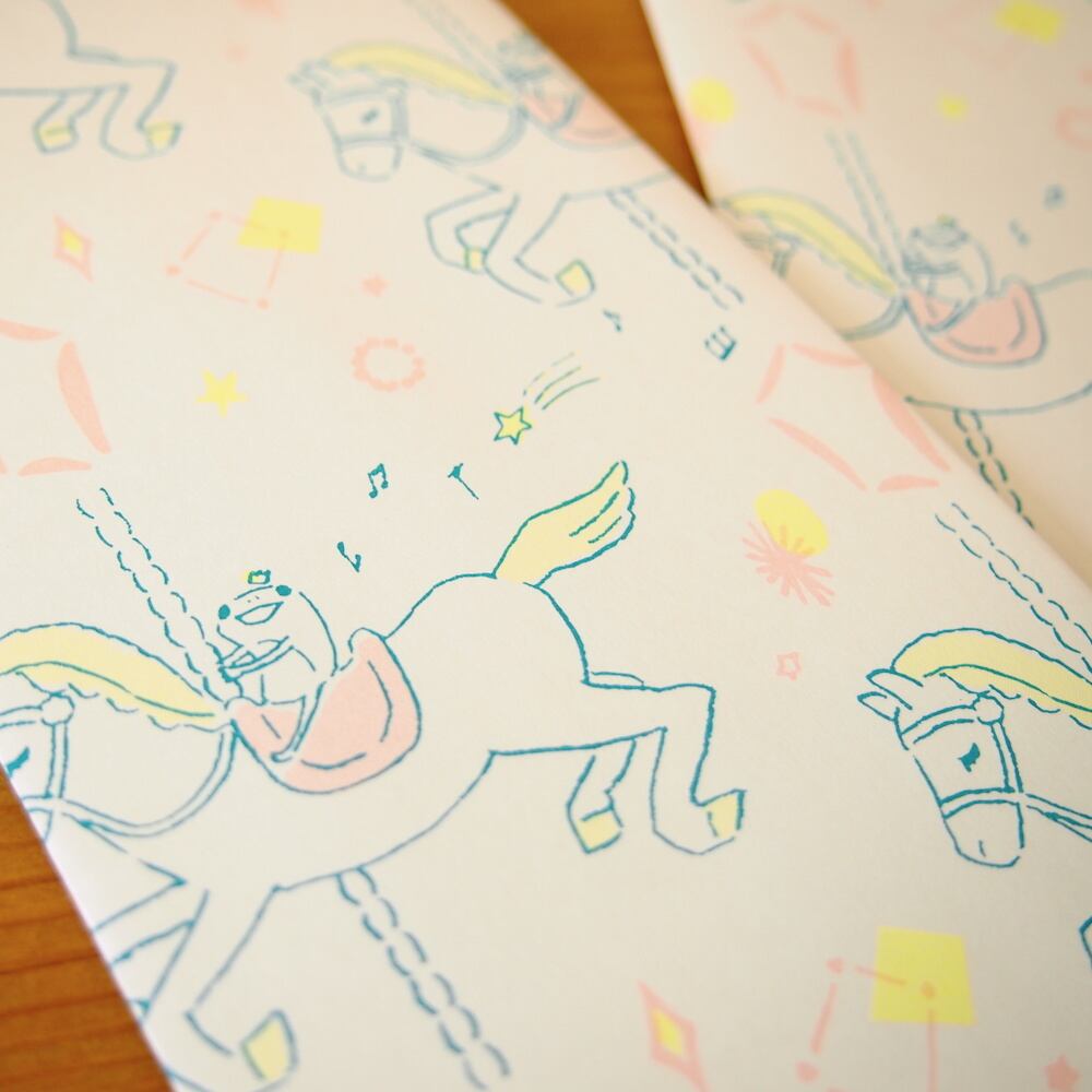 メリーゴーランドに乗ったカエル王子の周りにキラキラ模様を散りばめ、メルヘンな一枚に。