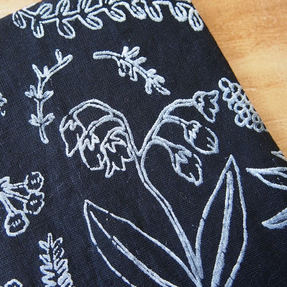 オリジナルの模様を手刷りでプリントした生地を使った、特別感のあるブックカバー。