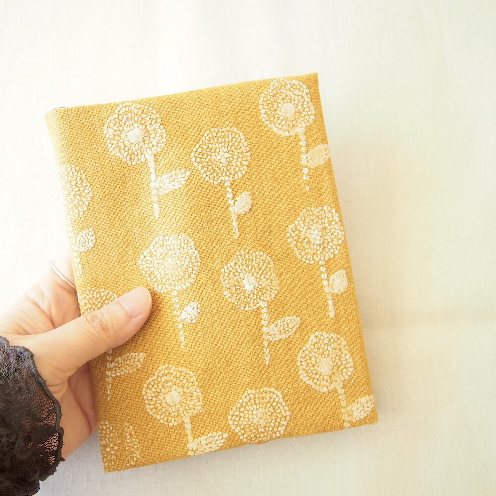 オリジナルの模様を手刷りでプリントした生地を使った、特別感のあるブックカバー。