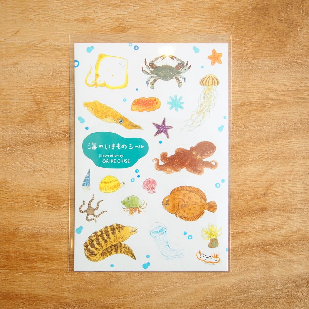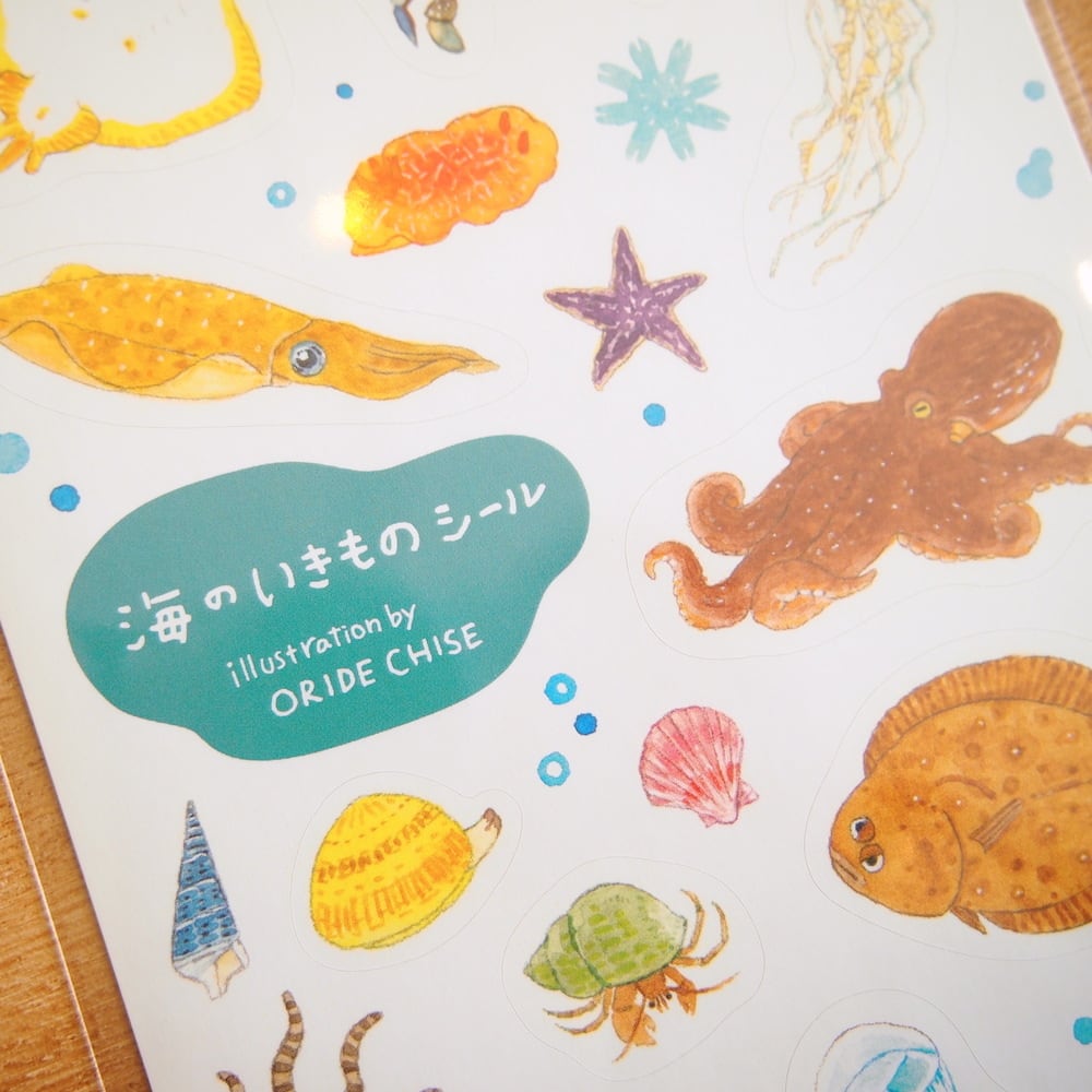 エイ、カニ、イカ、タコ、クラゲetc...海のいきものたちのイラストが描かれています。