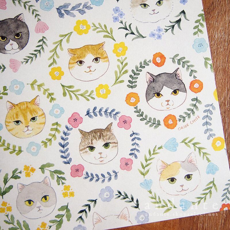 まるいお顔の猫たちがずらりと並んだ模様の便箋。