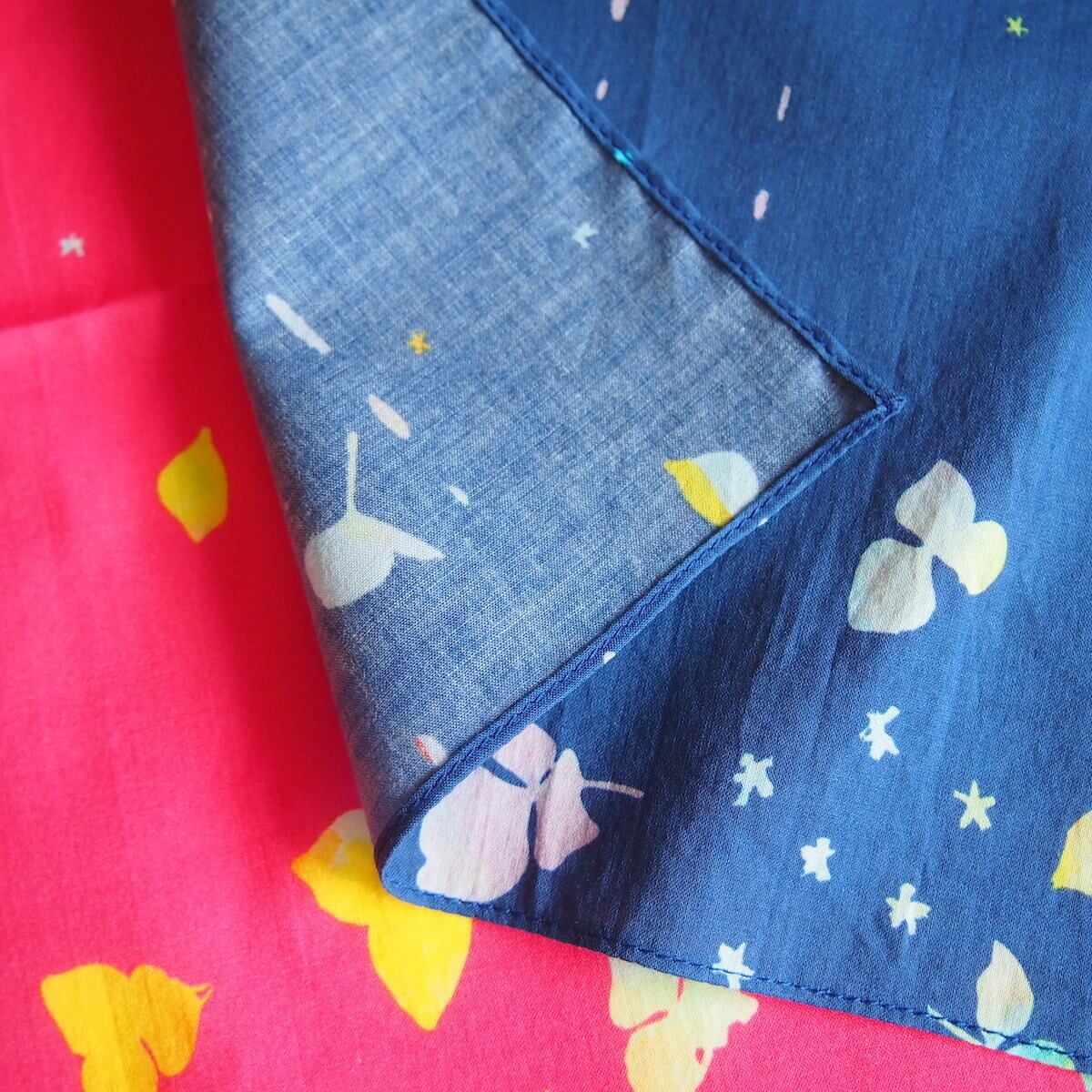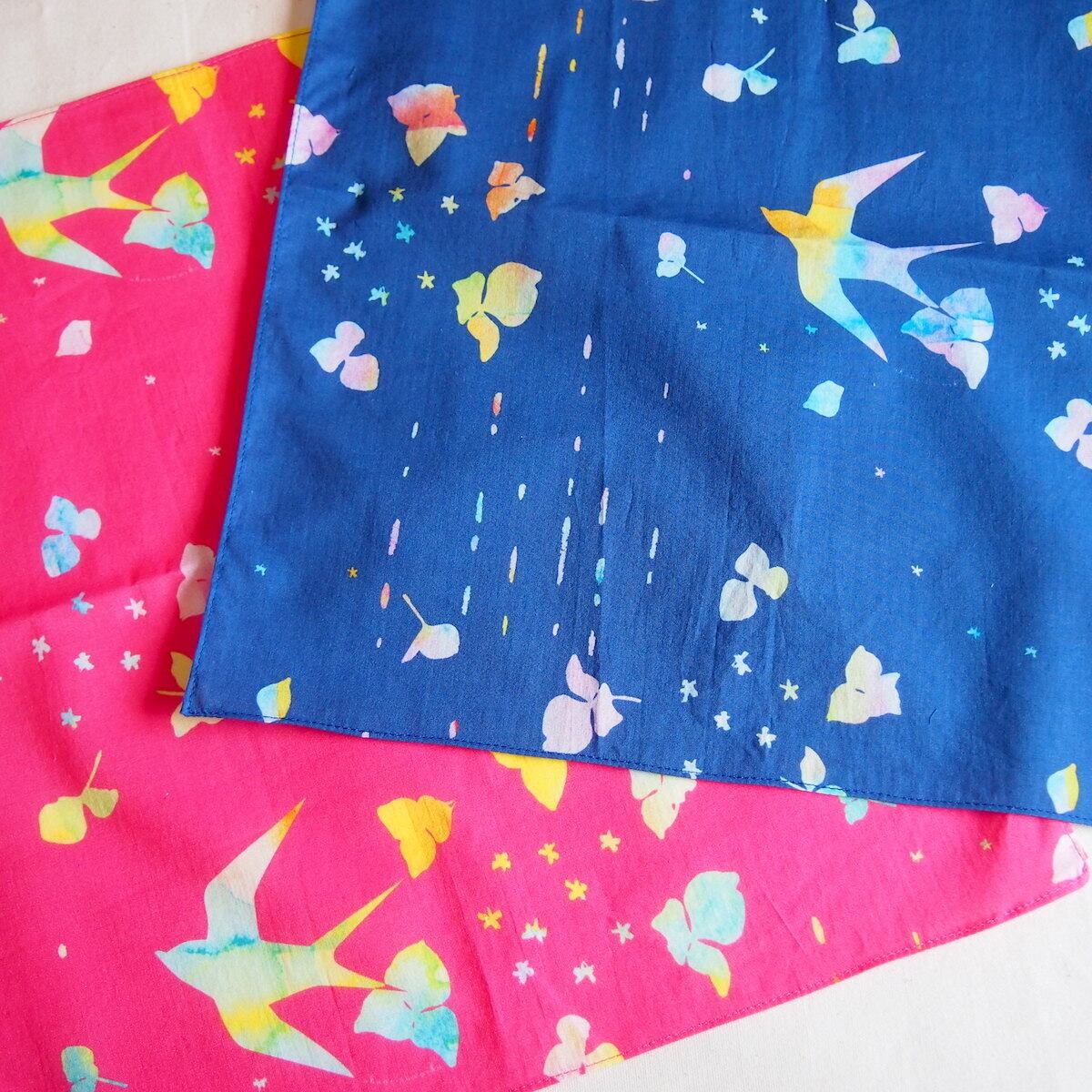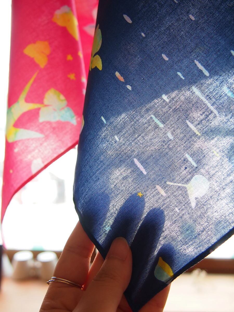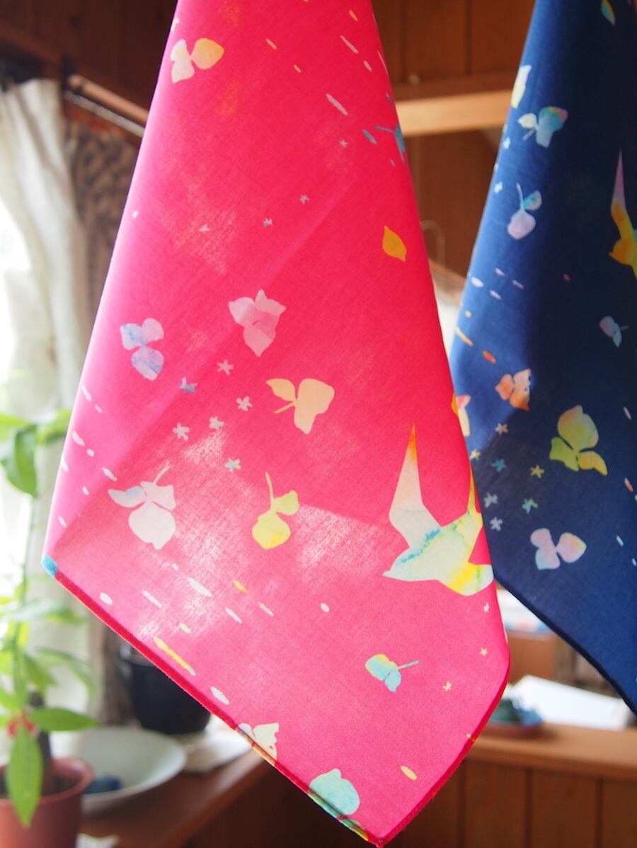 アカネイロワークスのデザインをプリントした生地でつくったハンカチです。