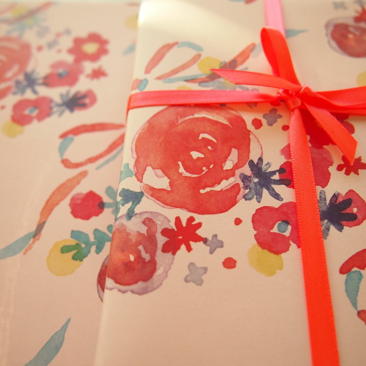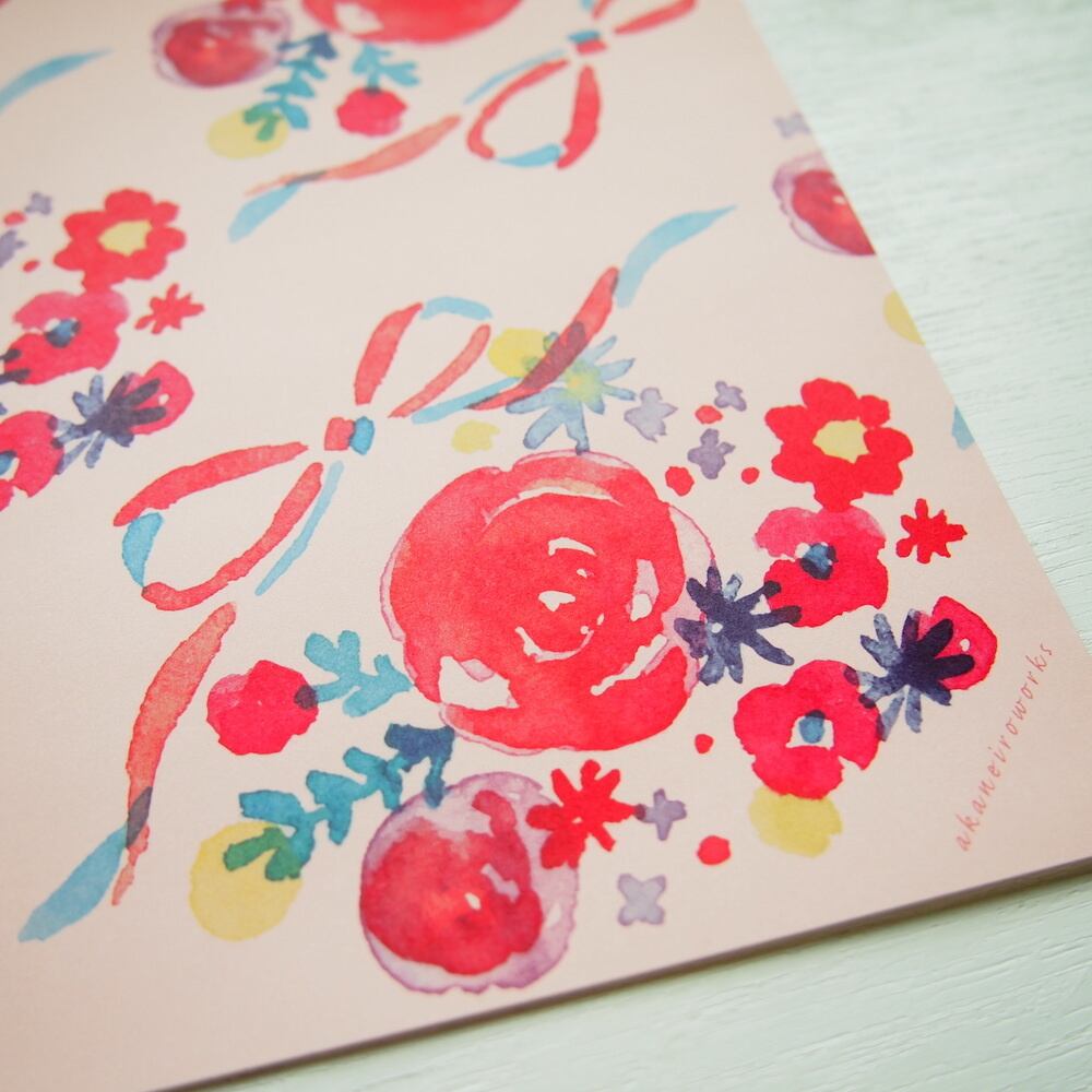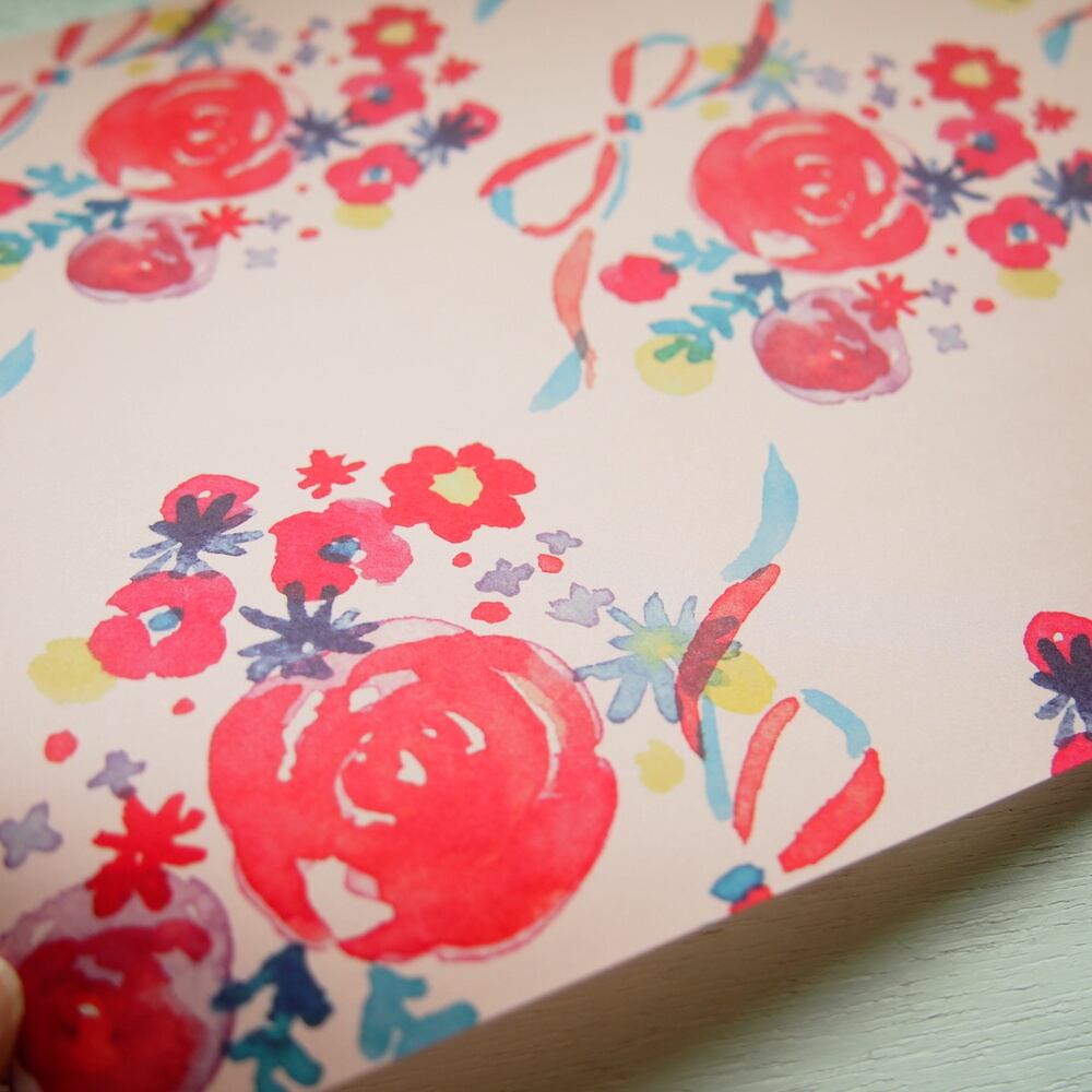 水彩で描いた色とりどりの花と、ワンポイントとなるリボンの連続模様。
