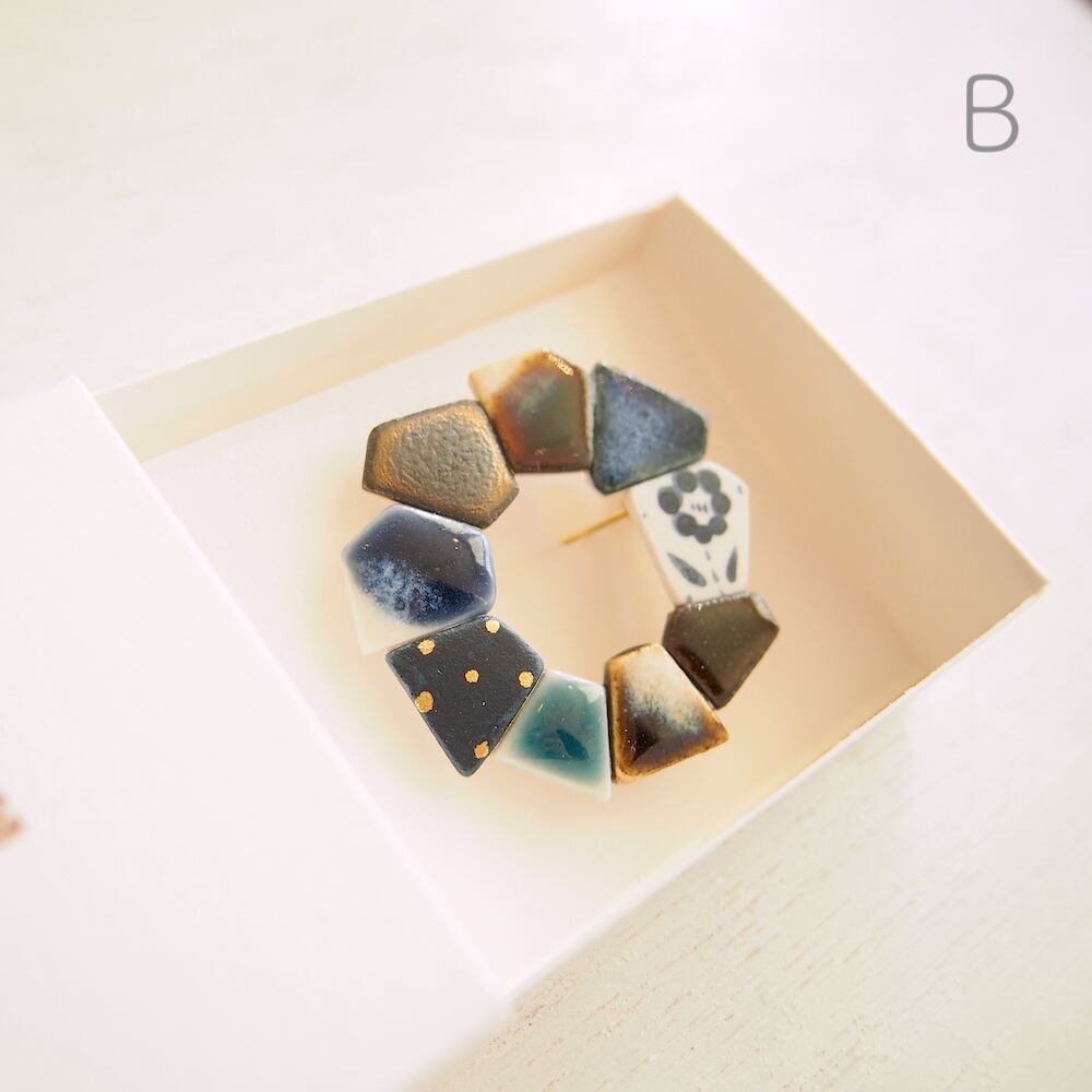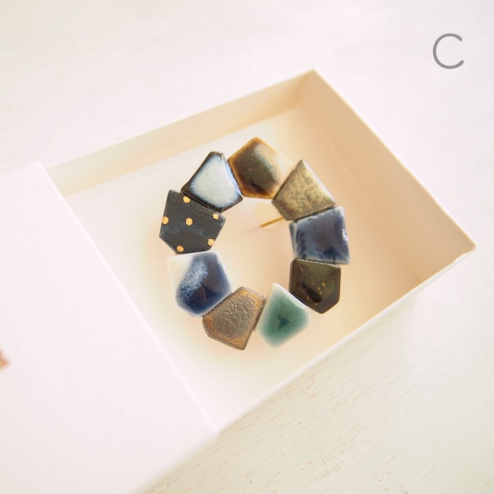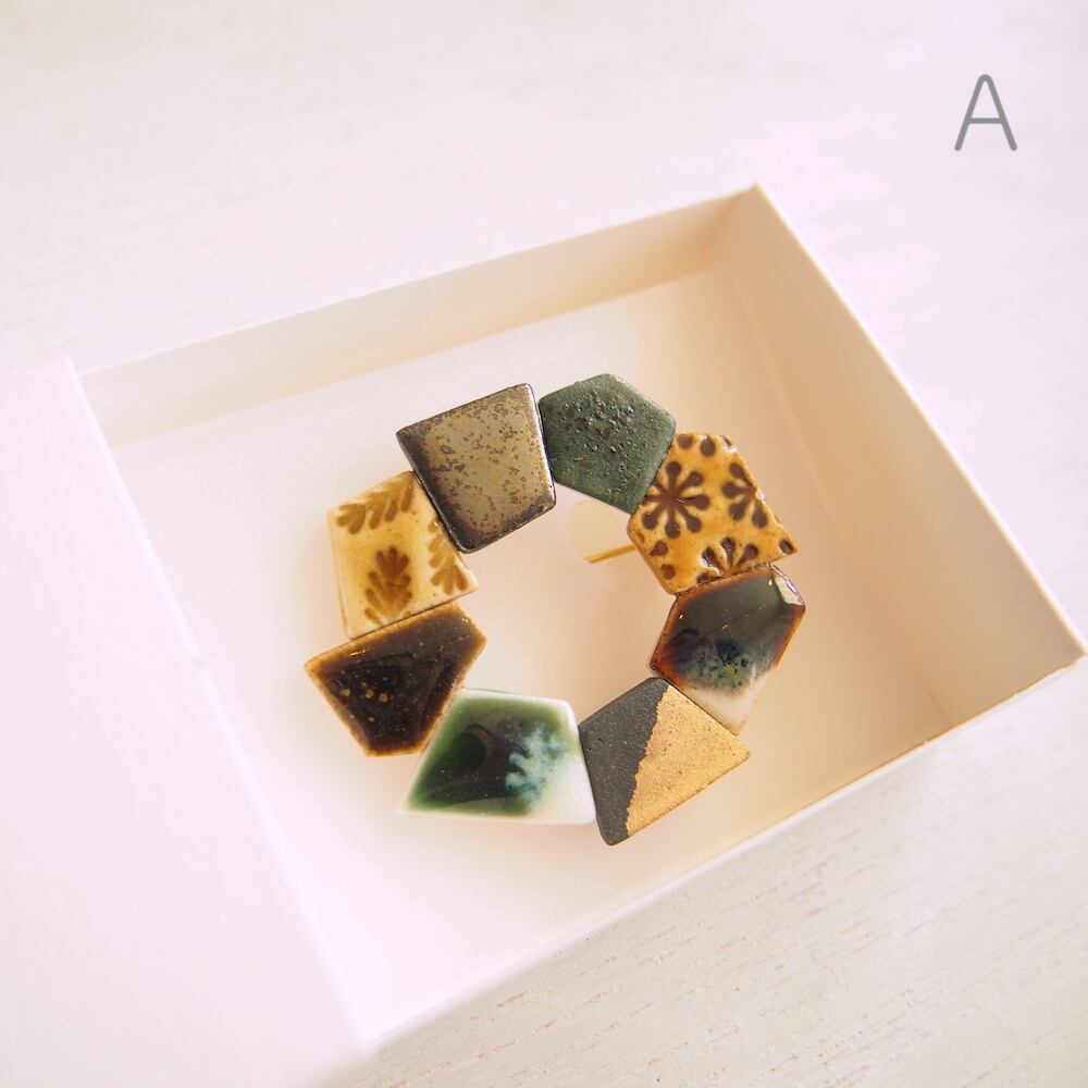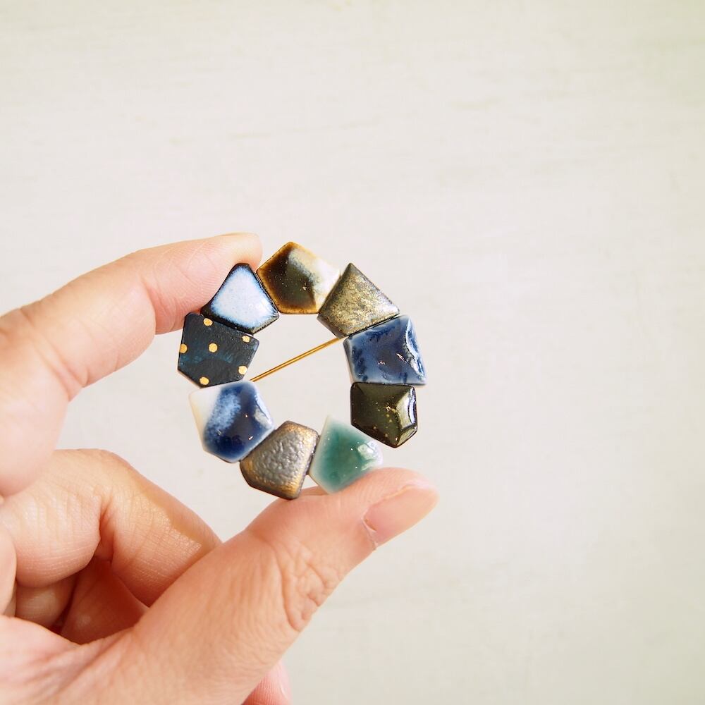一つのブローチの中にマットな質感、ツヤのある釉薬など様々な表情が楽しめます。