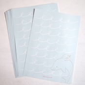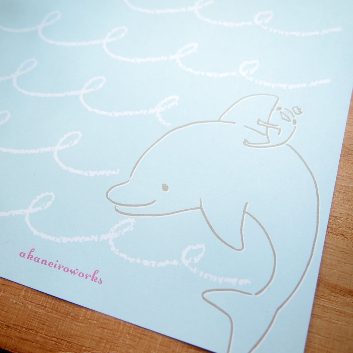 イルカに乗ったカエル王子と、波のような手書きのラインをシンプルにデザイン。